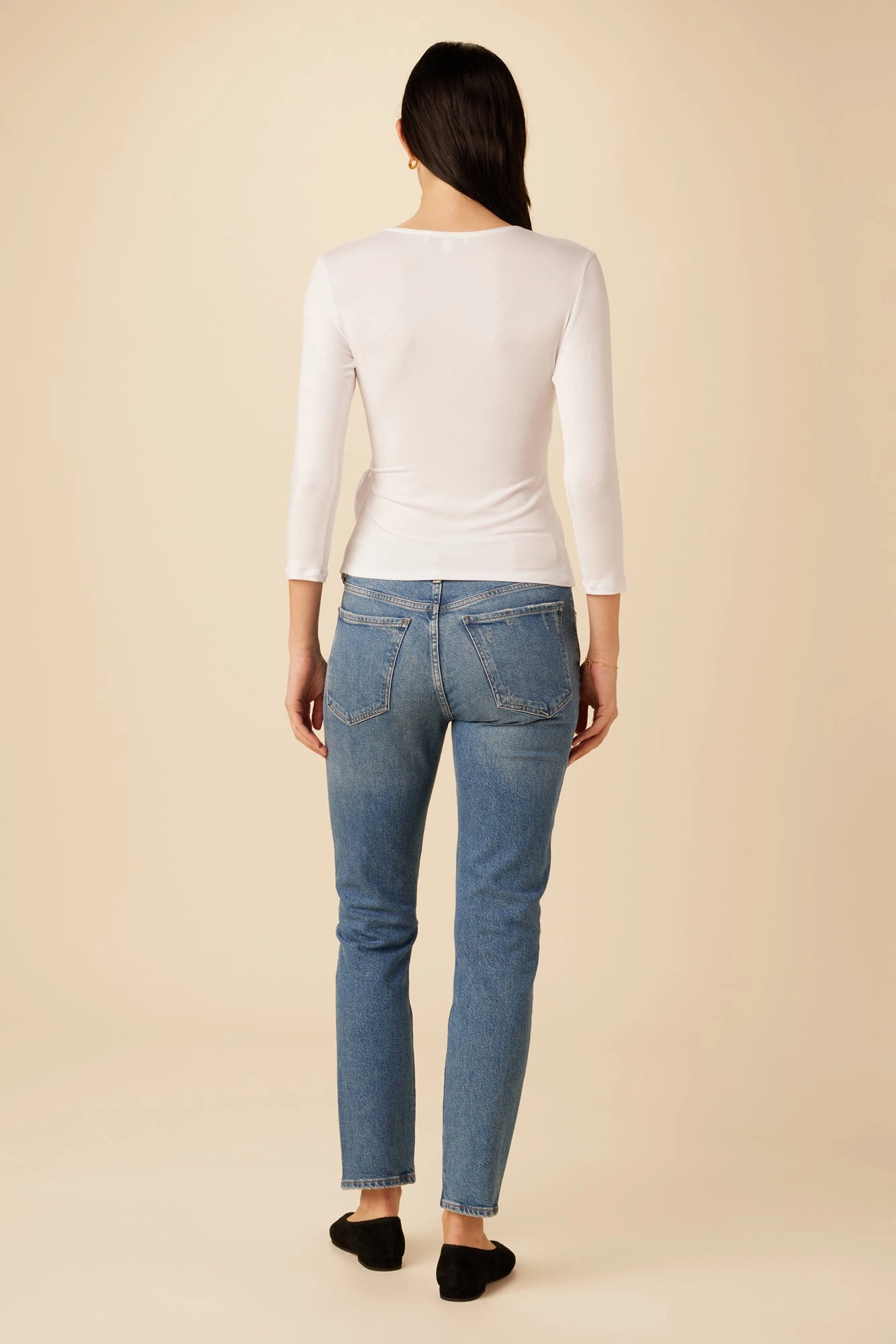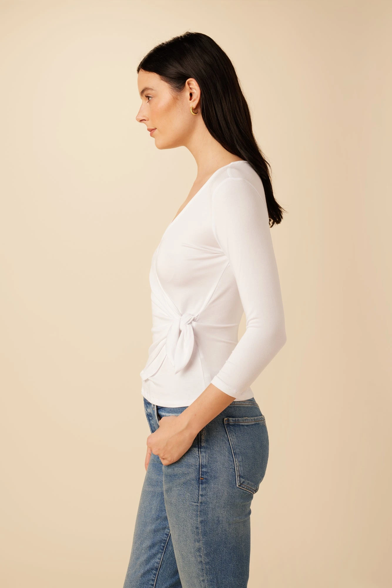 Made from sustainable TENCELâ„¢ modal fiber that’s responsibly sourced from beechwood forests. This top features 3/4 sleeves, slim fitting half wrap top with adjustable ties at side.Â