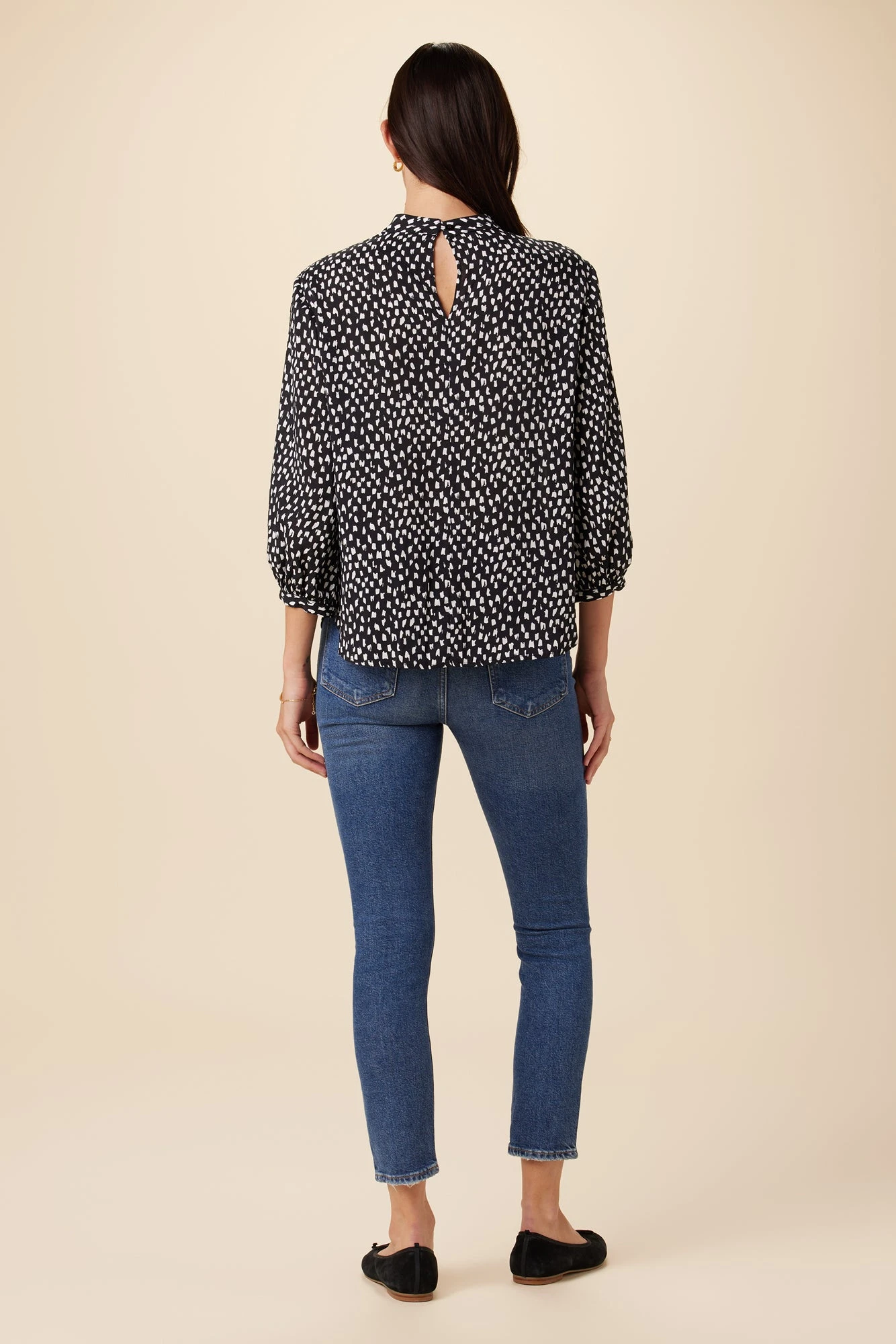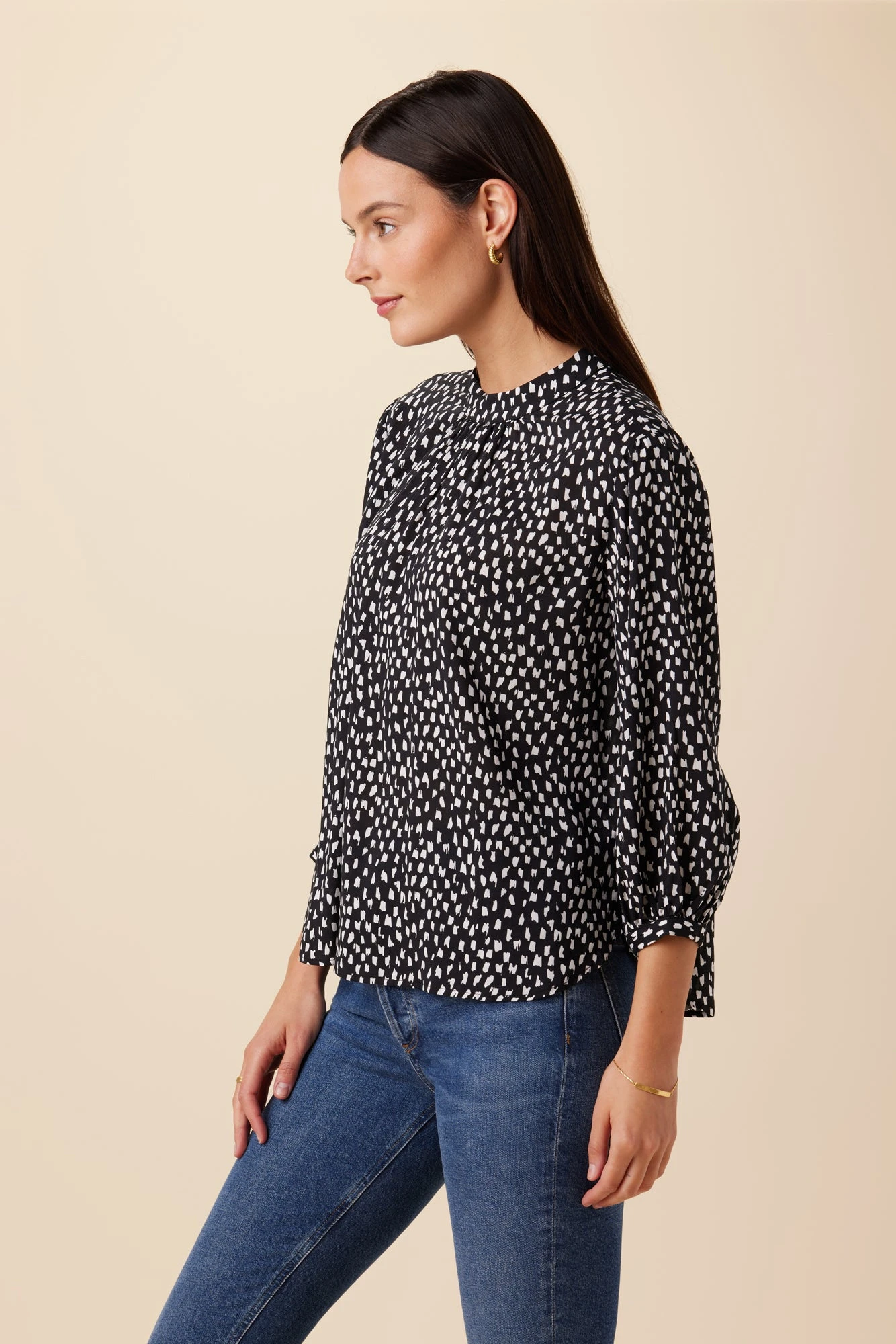 Mock neck, relaxed fit blouse featuring 3/4 slight puff sleeves, sheering at neck, pull on style with button closure at back of neck. Made from sustainable ECOVERO™ Viscose fabric, this easy top is destined to become a closet staple.
