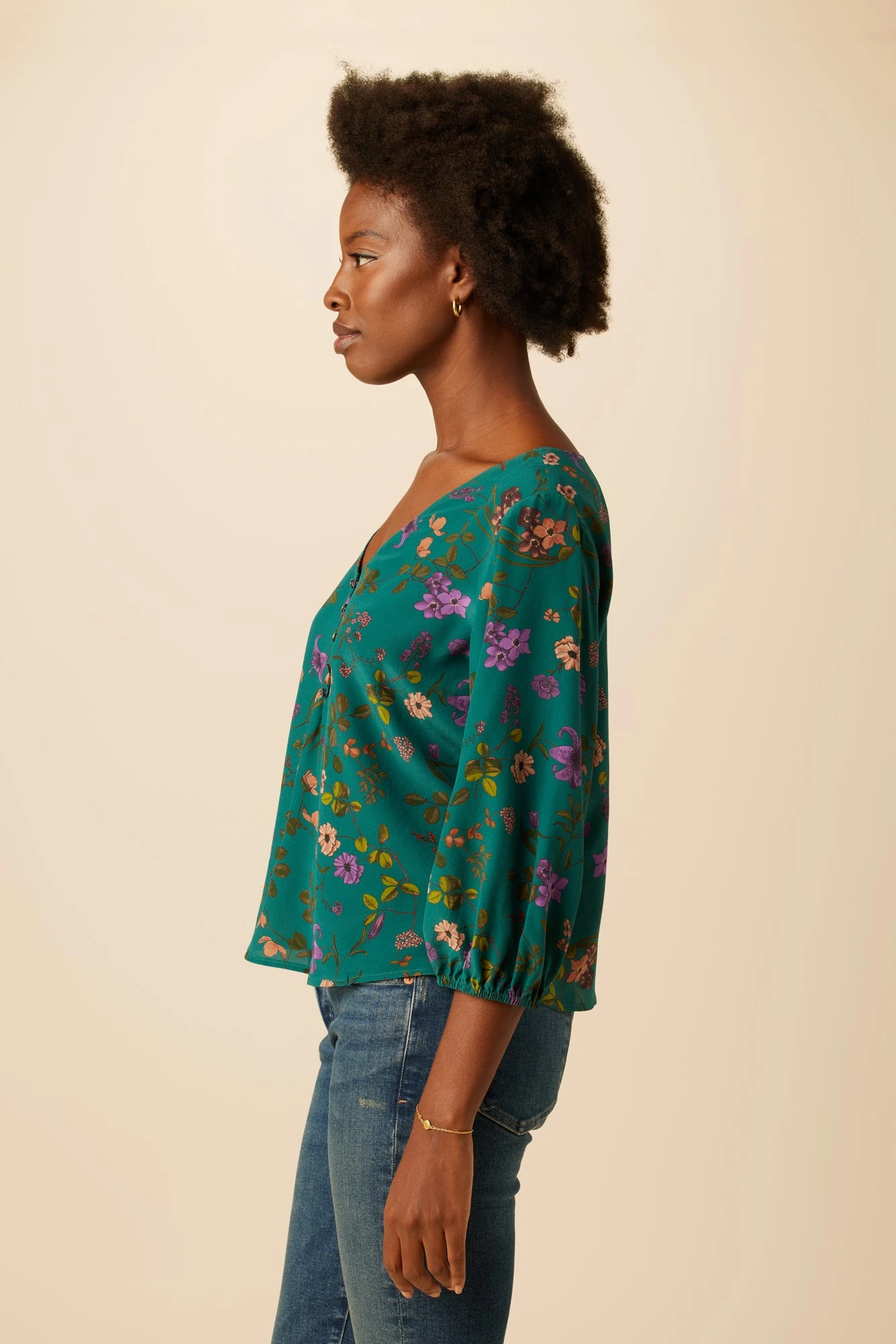 3/4 sleeve blouse featuring loop and button on center front, with slight puffing sleeves, made from our luxe Washable Silk.