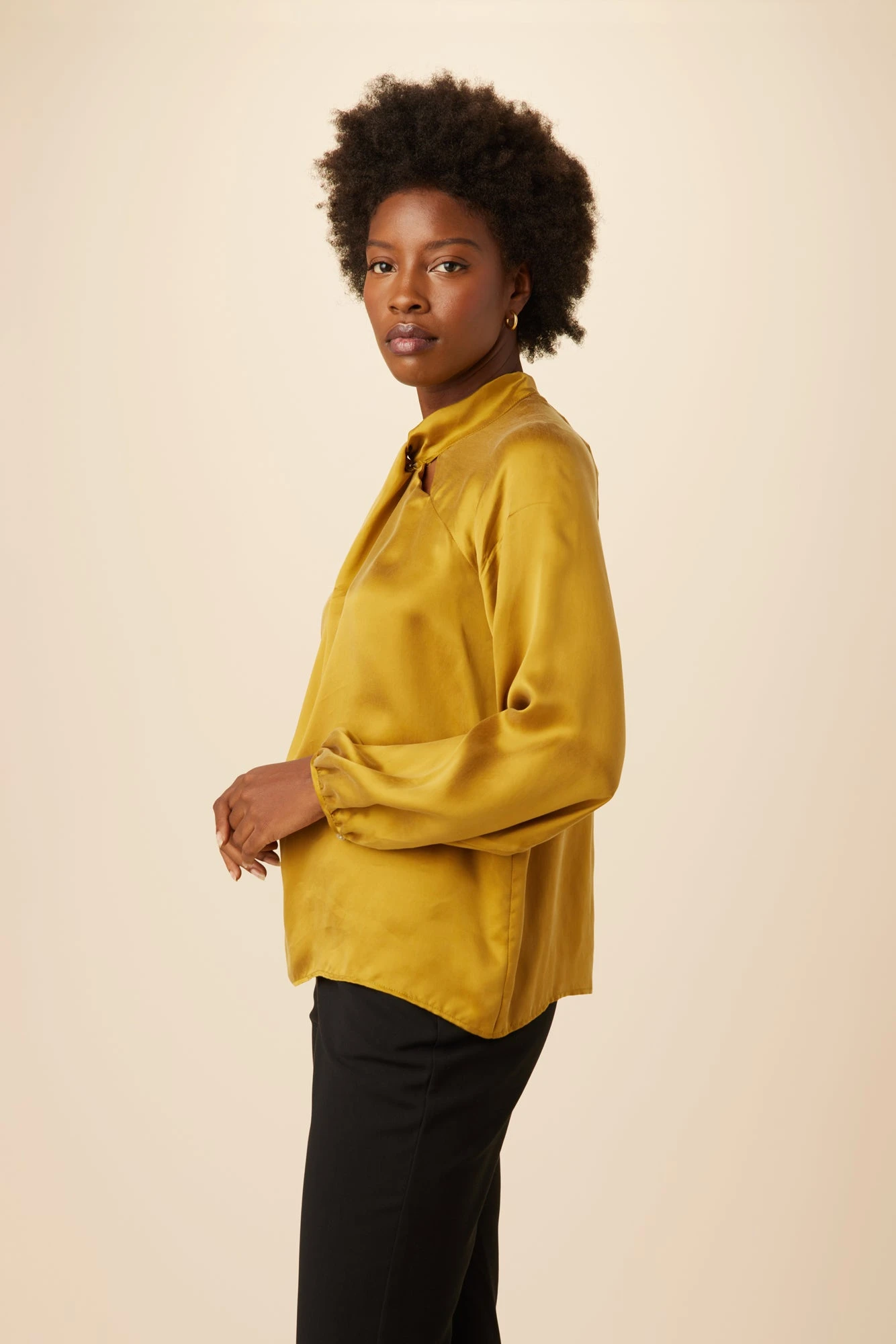 Blouse with long, voluminous sleeves, a fixed twist at the neck, and double button keyhole opening at the back neck. Made in our softest Cottonseed Cupro, a zero-waste fabric made from discarded cotton waste.