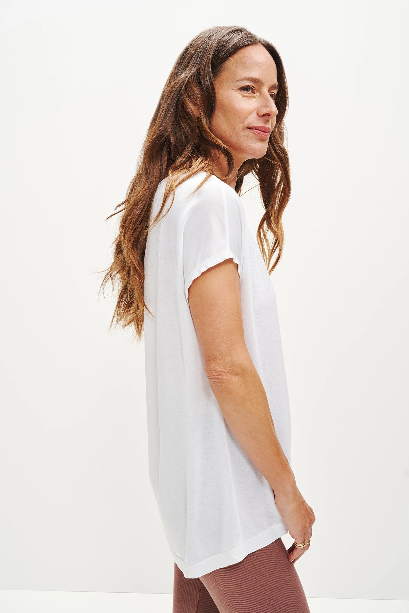 Short sleeve v-neck tee with a shirttail hemline and shirring detail at the back. Made in our softest Silken Modal, entirely cut from sustainable beechwood tree fibers.